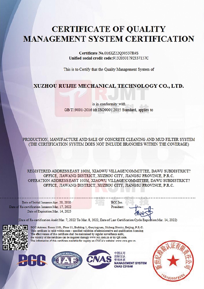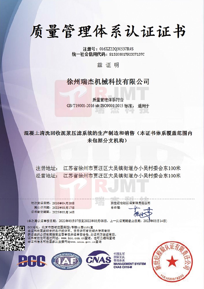 公司RJK系列混凝土清洗、污水回收以及泥漿壓濾系列產(chǎn)品在國內(nèi)率先同時(shí)獲得ISO9001:2008國際質(zhì)量管理體系認(rèn)證(BCC)證書...+ MORE